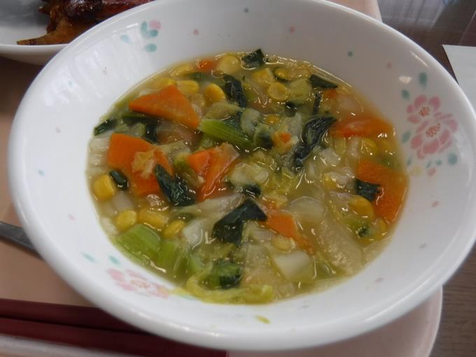 本日の献立:カルシウムパン、ローストチキン、野菜スープ、お星さまラスク