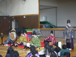 始まってすぐに『越天楽』の演奏が鳴り響き、体育館があっという間に雅な空気に包まれました。その後、楽器の紹介や楽譜を読む体験、楽器の体験など様々な活動を通して雅楽について学ぶことができました。見ているだけでは感じられない拍の取り方の難しさ、雅楽ならではの奏法を実感することができたようです。