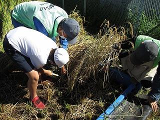 5月に田植えをして、大きく育った稲をボランティアさんの指導の下、鎌を使って順番に刈りました。