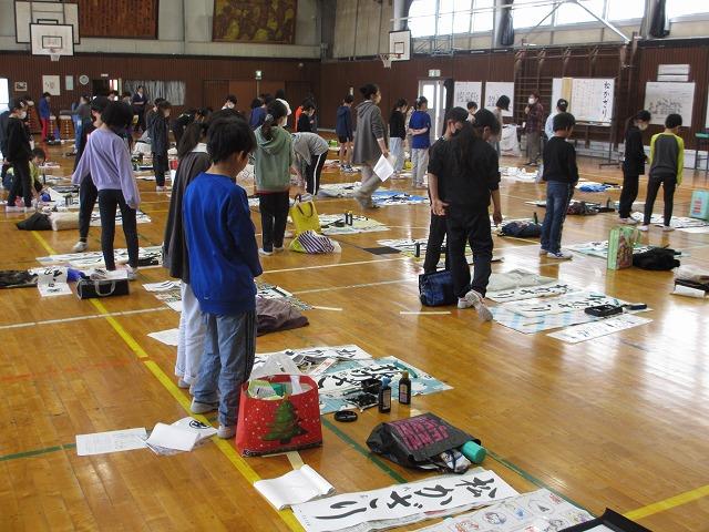 3年生は初めての書初めで、準備をするのが大変そうでした。3年生は「ふじ山」、4年生は「松かざり」を練習し、立ち上がってお互いの作品を見合っていました。初めに書いた作品より上達している児童が多く見られました。