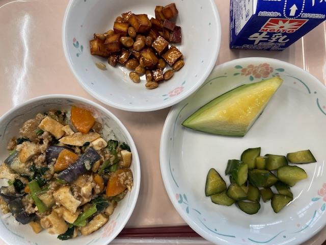 <今日の献立>なすと生揚げの肉味噌丼、さつま芋と大豆の黒蜜がらめ、中華きゅうり、メロン