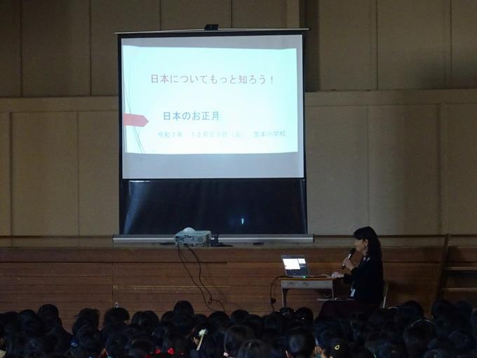 校長先生からは、「日本についてもっと知ろう」というお話で、日本の年末年始における伝統的な行事等についてお話がありました。冬至・大掃除・大晦日(年越しそば・除夜の鐘)・元日(元旦との違い・おせち・お雑煮・初詣)・初夢・年賀状・七草がゆ・鏡開きなど、この時期しか体験できない日本の文化にたくさん親しみ、楽しい冬休みを過ごしてくださいとお話ししました。
