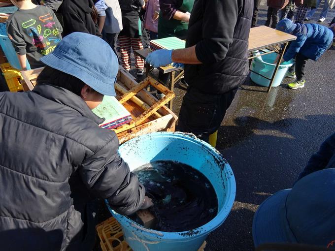今回体験する海苔すきは昔ながらの手作業です。現在は工場で海苔作りをしているため、このような海苔すきは行っていないそうですが、海苔がどのように作られているのか学習するよい体験となりました。まずは水に浸されている海苔をすくいます。