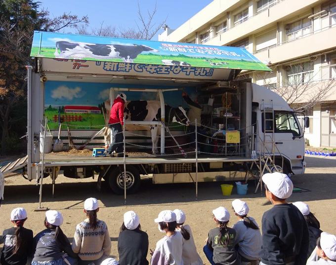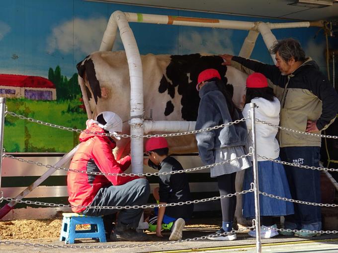 大きな乳牛は、乳搾りを体験させてくれました。初めて体験する子もおり、牛の乳やとれたての牛乳があたたかいことに感動していました。また、絞るとたくさん牛乳が出ることにも驚いていました。