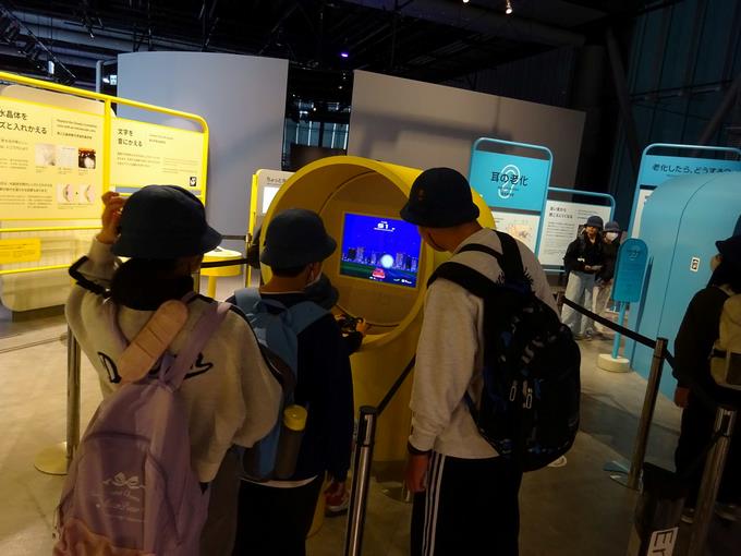 日本科学未来館では、幅広い科学技術を体験してきました。環境問題等の科学技術があり、SDGsについて学んでいる5年生にぴったりな見学場所でした。特に人気だったのは「老いパーク」という人間の老いを体験できるブースでした。耳の聞こえをテストするブースでは、子供たちはほぼ10点満点なのに、ある担任は8点しかとれず、落ち込んでいました。
