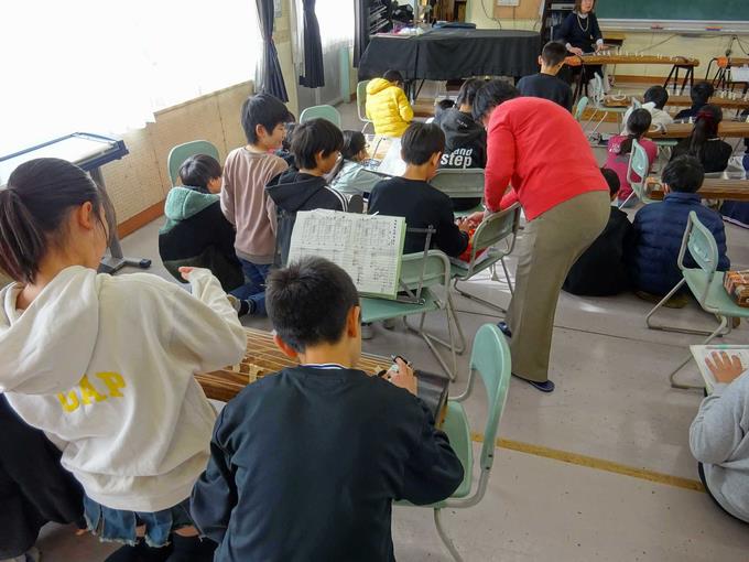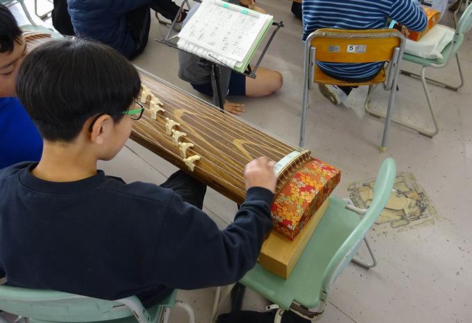 音楽の授業でも琴に触れていますが、今回は特別な講師の先生をお呼びしてより詳しく教えていただきました。「春の海」という正月によく流れている有名な曲を演奏しました。指使いはおぼつかないながらも、グループで教え合いながら、丁寧に演奏していました。琴の美しい音色で、曲がうまく弾けるととても嬉しそうでした。