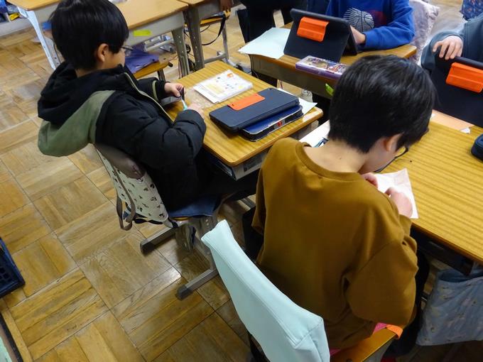 4年生のお題は「初もうで」です。4年生は昨年度経験しているので、落ち着いて取り組んでいます。漢字とひらがなのバランスに気をつけながら丁寧に書いていました。