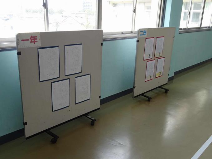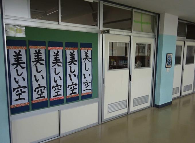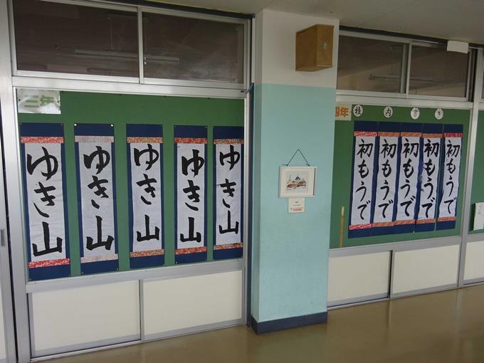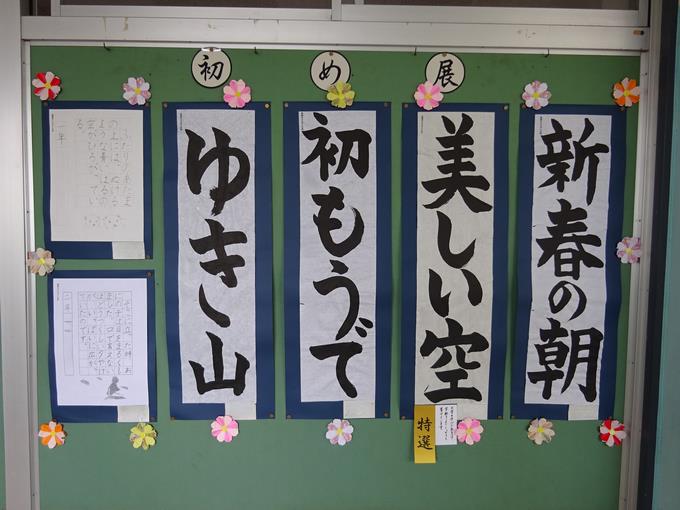 1月19日から2月16日までの期間に校内書き初め展が開催されています。教室の前の廊下に作品が掲示されています。また、学級代表・学年代表の児童の作品は図工室前に掲示されています。