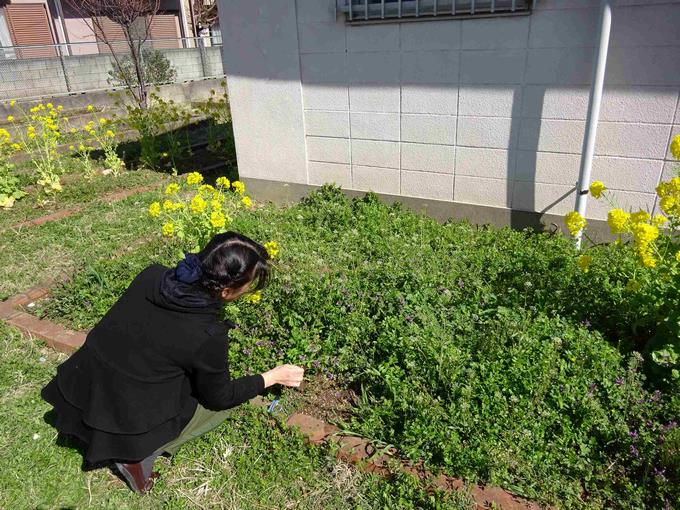 プール横にはおやじの会の花壇があります。現在は菜の花がきれいに咲いています。写真は菜の花泥棒ではなく、校長先生です。あまりにきれいに咲いているので、許可を得て、校内に飾ることにしました。どこにあるか見つけてみてください。