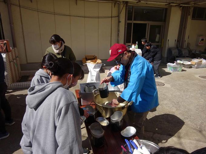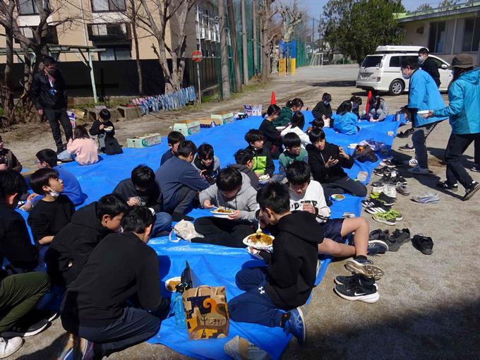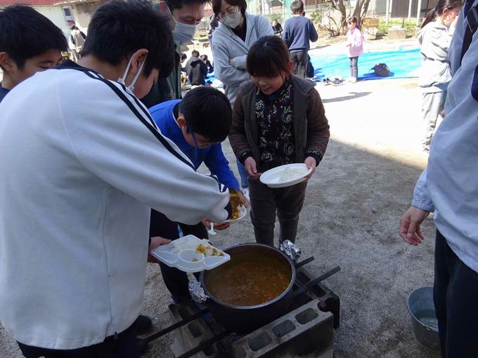 じっくり時間をかけて、飯盒もカレーも火を通しました。完成したごはんは炊きたてでおいしく、カレーはじっくり煮込まれて野菜の味がたっぷり染みこんでいました。ちなみに米は東光寺からのご寄付とのことです。天気がよく、暖かかったので、食が進みます。たくさんおかわりをして、青空の下楽しそうに食事をしていました。