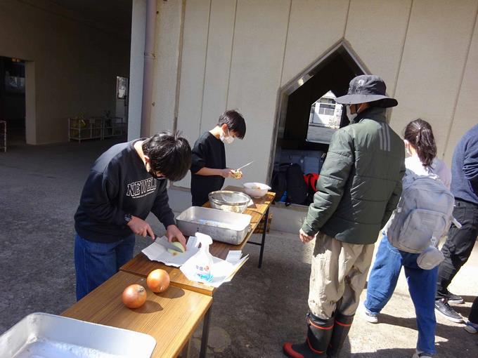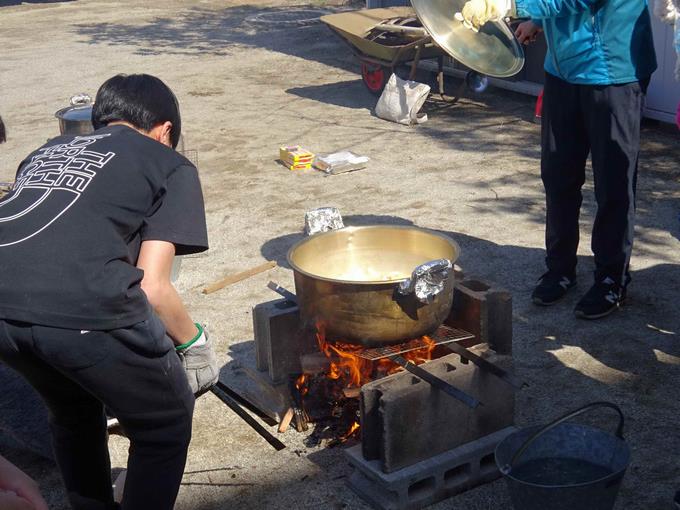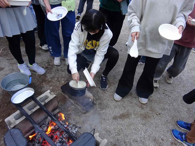 まずは飯盒のかまどを作る「竈グループ」と米を研いだり、材料を切ったりする「調理グループ」に分かれて作業します。「竈グループ」は火を起こすのに苦戦しつつも慣れてくると上手に火を扱っていました。「調理グループ」は米を研いだり、野菜や肉を食べやすいサイズに切ったりします。米を炊く学習や野菜を切る学習は家庭科でしっかり経験しているので、どの子も上手に取り組んでいました。
