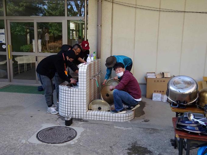 おやじの会は最後の片付けまでぬかりはありません。ごはんやカレーのこびりつきもしっかり落とし、来年度の飯盒炊爨に備えます。本校職員も手伝っています。