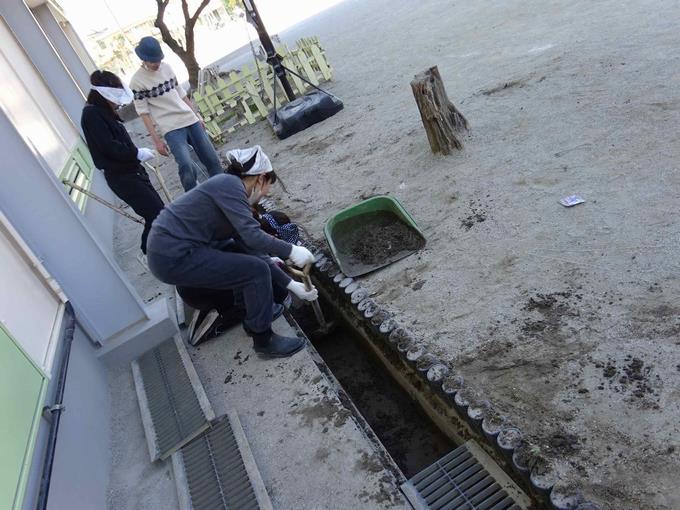 汚水をみんなで押し流しながら、汚れのひどいところは高圧洗浄機で洗ったり、たわしでごしごしこすったりして、きれいにします。2年生の先生方はやごを捕まえていました。教室で見せてもらってくださいね。
