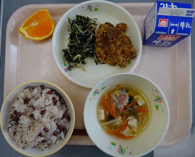 今日は今年度の給食最終日でもありました。6年生にとっては宮本小学校最後の給食となります。今日のメニューは「6年生リクエストメニュー&卒業お祝いメニュー」というスペシャルメニューで「赤飯・鶏肉の唐揚げ・磯香和え・すまし汁・デコポン・牛乳」でした。すまし汁には「祝」とかかれた「なると」が入っていました。