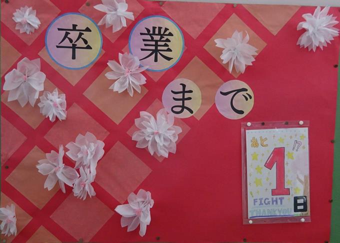 校内には卒業に向けてのお祝いの掲示物があります。6年生のカウントダウンカレンダーもついにここまで来ました。寂しいですね。