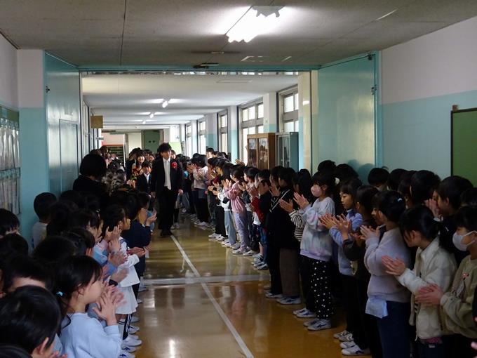 お別れ式第2部では、1~4年生が南北通路に集まって、6年生のお見送りをしました。みんな笑顔で見送っていましたが、中には涙を流している子もいました。