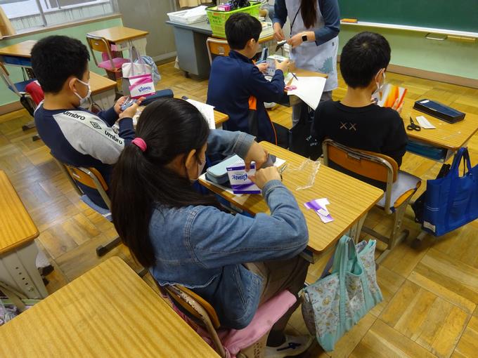 3年4組を中心にワークショップを行いましたが、オンラインで他のクラスにもつなぎました。また、作品作りの時間にはトーブンさんが各教室を巡り、いろいろなことを教えてくれました。