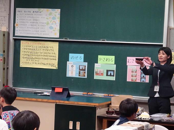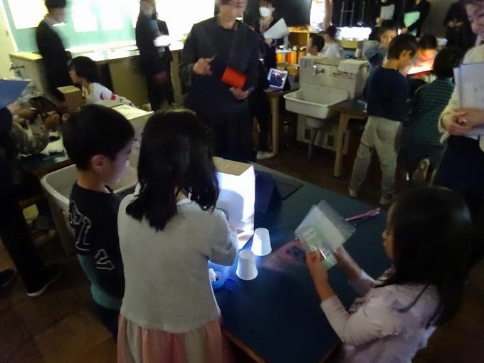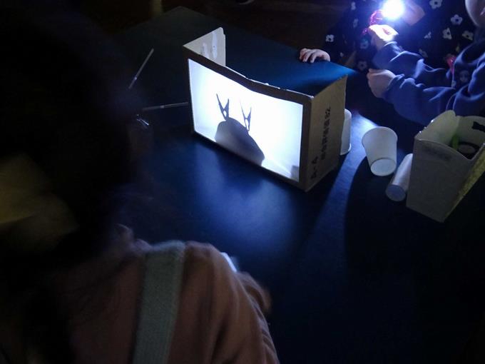 1年生の授業では、影遊びの単元で、教室内でもライトを照らして影絵遊びができるということから、物を「のせる」「かさねる」「むきをかえる」をキーワードに工夫した影遊びを行いました。創造力のあふれた作品がたくさんあり、子供たちも楽しんで活動していました。できた作品をタブレット端末で撮影し、後日「かげえしゃしんてん」を開く予定です。