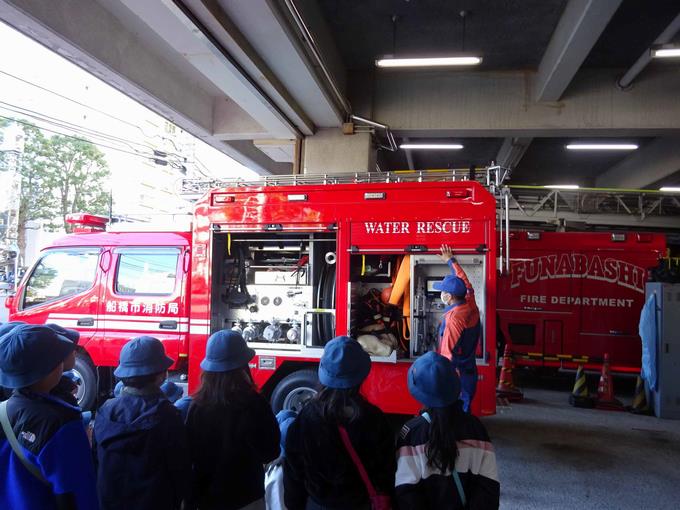 消防車や救急車の中を見せていただいたり、消防署庁舎の中を見せていただいたりしました。また、職員の方には、見学をしながら丁寧に説明をしていただき、子供たちはいろいろなことを学ぶことができました。仮眠室や食堂は、職員の方が普段どのように1日を過ごしているのかがわかるよいきっかけとなりました。中央消防署にしかない、水難救助車も見せていただき、とても有意義な見学となりました。