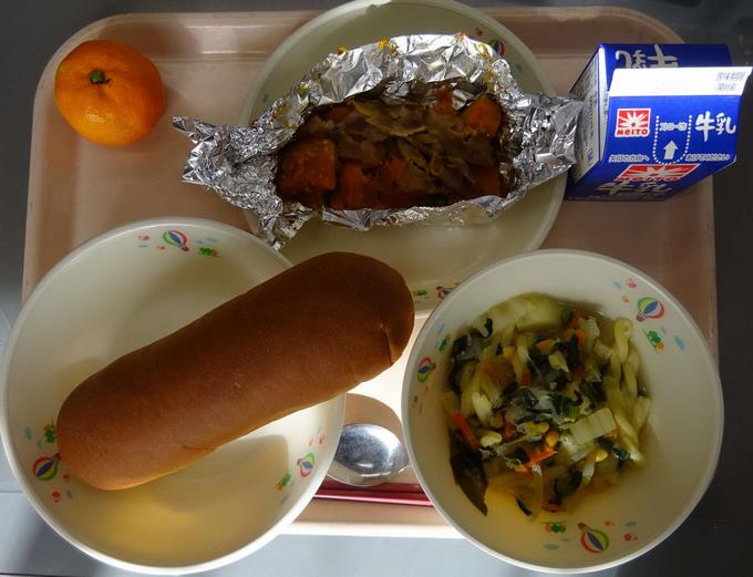 2025年最後の給食は、冬至メニューでした。「黒糖コッペパン、かぼちゃのベーコン巻き、マカロニスープ、みかん、牛乳」です。冬至に幸運を呼び込むため、「ん=運」が重なる食材を食べるようになり、「なんきん」と呼ばれるかぼちゃを食べるようになったそうです。