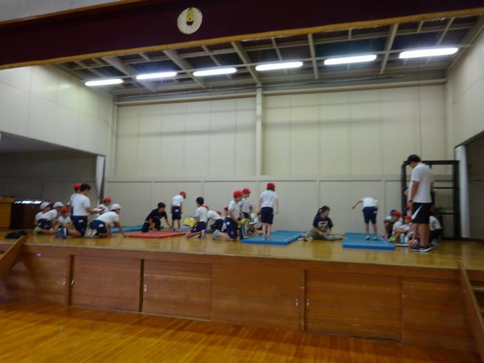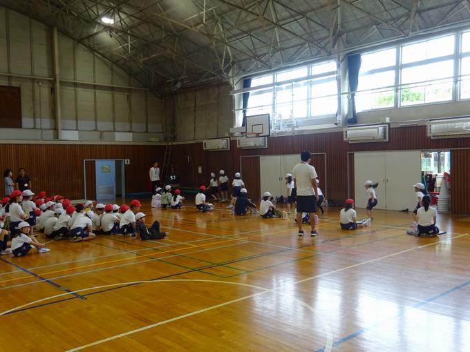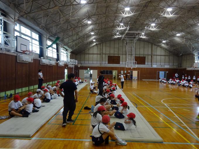 今日は2年生が5年生に、1年生が6年生に手伝ってもらって、測定していました。1年生は初めての体力テストでした。6年生に手本を見せてもらったり、数を数えてもらったりしながら、楽しそうに活動していました。