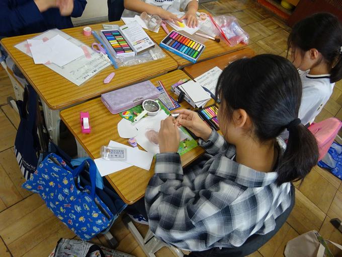 パステルアートクラブです。チョークに似た「パステル」という画材を指やコットンで紙に塗り、ふんわりと柔らかい絵を表現して作品を作ります。きれいな色で、癒やされるような絵を描いていました。