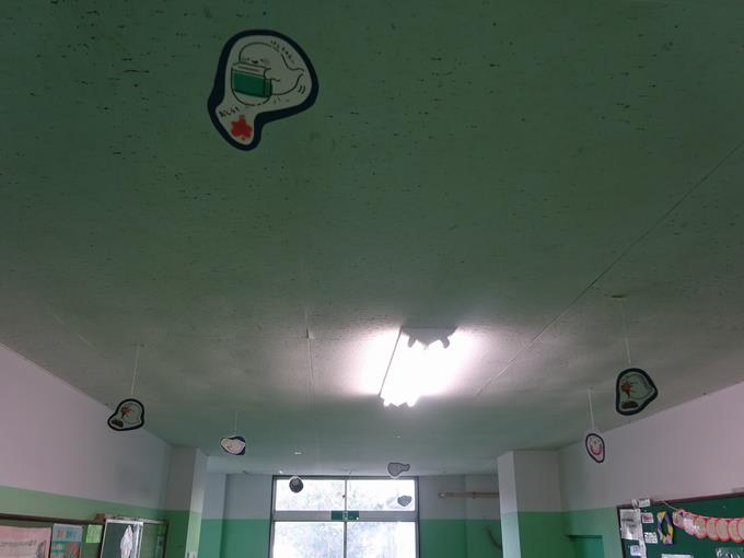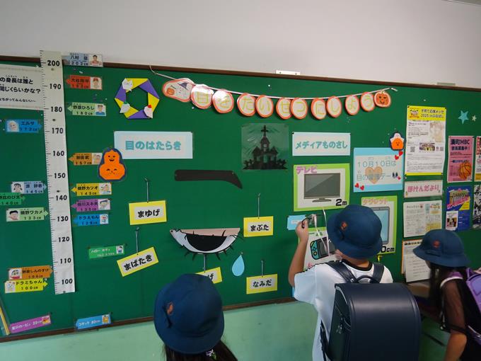 昇降口から保健室に向かうところにある掲示板が賑わっています。天井にはハロウィンの飾りが登場し、壁面には10月10日「目の愛護デー」にあわせて掲示物が飾られています。