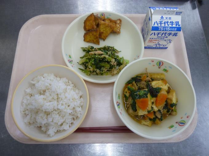 献立・・・麦ご飯、生揚げのカレー煮、茎わかめのごまあえ、さつま芋のきなこかけ、牛乳