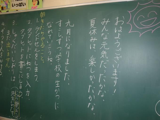 2年生の教室では電子黒板を活用して、夏休みのできごとを発表しています。今日から各学年ごとに発育測定が始まりました。9月の身長と体重を測定します。今日の給食のメインはソフト麺肉味噌ソースです。