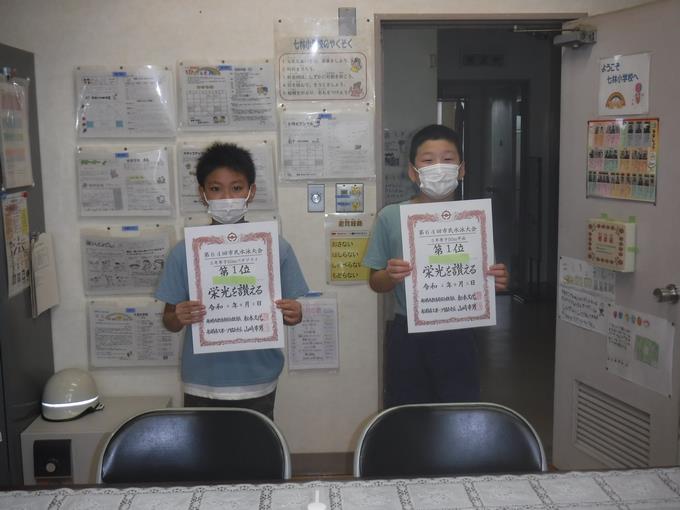 夏季ミニバスケットボール大会(フレンドシップ)では、男子の部に2チーム出場し、2チームともリーグ優勝です。3年ぶりに開催された市民水泳大会小学生の部では、5年男子50m平泳ぎと5年男子50mバタフライで市内第1位に輝きました。おめでとうございます。