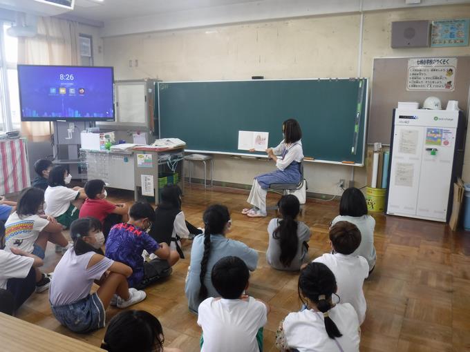 今朝は、ねこバスお話の会の皆さまによる読み聞かせがありました。1年生の教室の様子をご覧ください。