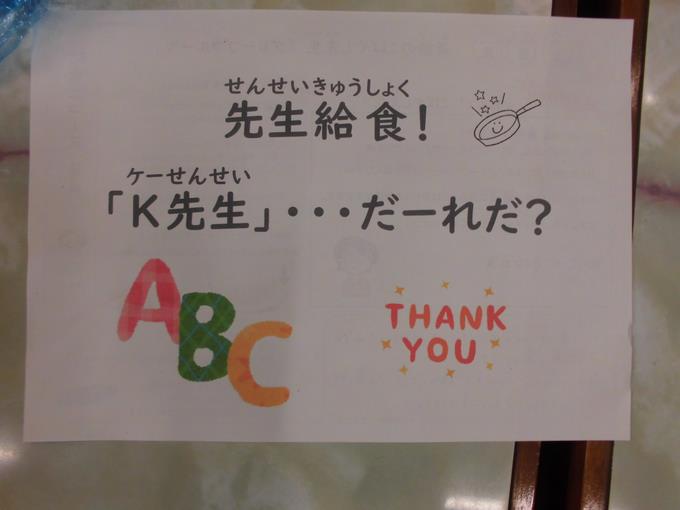 「先生の思い出給食」のトップバッターです。秋田の郷土料理の「だまこ汁」が思い出の味のK先生は誰でしょう。「だまこ汁」のお団子がとってもおいしかったです。ごちそうさまでした!