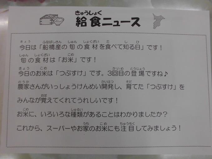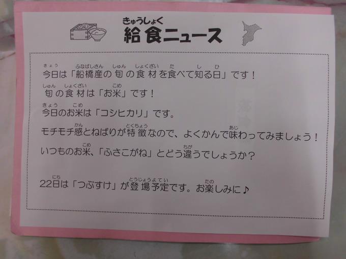 「船橋産の旬の食材を食べて知る日」でした。旬のほうれん草、小松菜は甘みがありとてもおいしかったです。もっともっと旬の野菜を味わいたいと思いました。「ごちそうさまでした!」