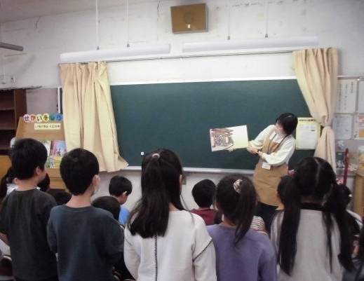 学校司書の読み聞かせを真剣に聞いています。