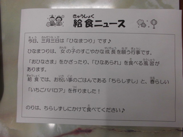 今日はひなまつりですね。きっと夕食でもちらしずしを食べる子もいるでしょう。具だくさんでとてもおいしかったです。「いちごババロア」は給食室の手作りです。給食室の皆さん、とてもおいしかったです。「ごちそうさまでした!」