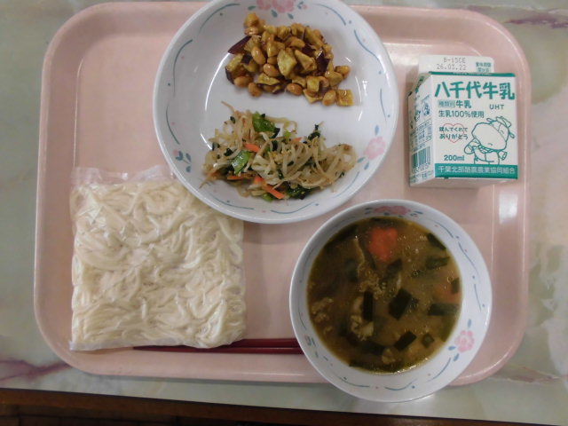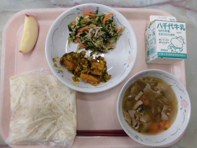 虹組のリクエストで沖縄そばです。豚肉たっぷりでボリューム満点でおいしかったです。給食で沖縄の郷土料理を味わえるのはうれしいですね。