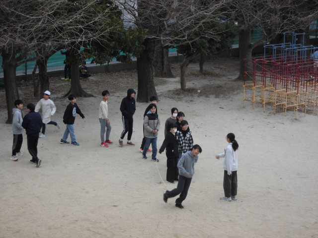 業間休みに、6年生が長縄に取り組んでいました。