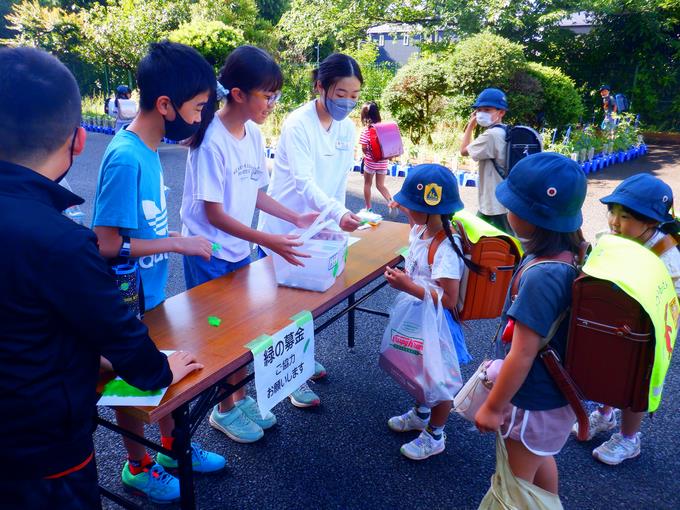 児童会の活動の一環として「みどりの羽根の募金」運動が始まっています。この運動は、植物を育て、守ることを目的とし、社会貢献の一つとして行っています。児童会の子供たちが、放送で目的を説明し、賛同してくれた子供たちが自分のお小遣いの中から、もしくはお家の方と相談して参加してくれました。