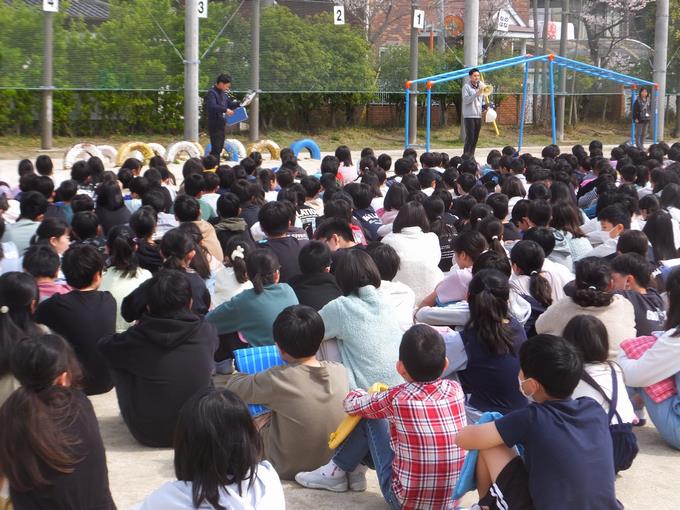 満開の桜が児童を迎え、 令和6年度がスタートしました。体育館で着任式と始業式を行いました。