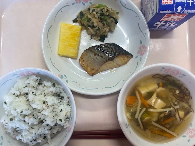 今日の給食には、12月から2月頃が旬の「鰤(ぶり)」が出ました。この時期の鰤は「寒ぶり」と呼ばれ、脂がのって特においしくなります。今日はにんにくやしょうがを入れたたれにつけて、焼いてありました。唐辛子も入っているので、少しピリッとした味です。魚が苦手な人もいると思いますが、魚には、体、筋肉や血、骨などをつくる「たんばく質」が多く含まれています。また、今日の鰤は、魚屋さんが骨をとってくれているので、食べやすいです。まずは一口から、挑戦してみてほしいです。