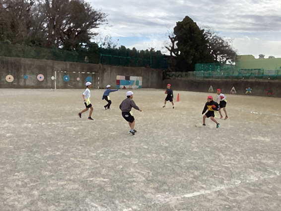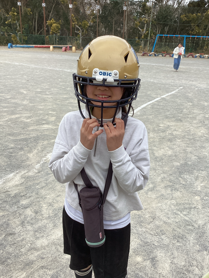 当日は「仲間を大事に、相手も大事に」をめあてに掲げ、腰につけた「フラッグ」を取り合うフラッグフットボールを体験しました。 まずは「しっぽ取りゲーム」からスタートしました。選手からフラッグを取るコツや守るコツを教わり、全力で体を動かしました。中には一度に8枚ものフラッグを取った児童もおり、会場は大きな拍手に包まれました。
