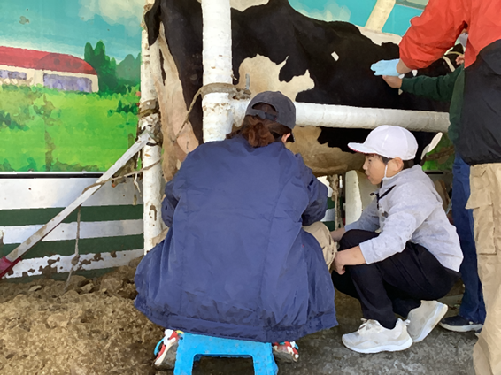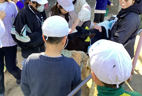 ふれあい体験では、子牛をなでながら「家でも飼いたい!」と夢中になる児童も多く見られました。また、乳搾り体験を通して「思ったよりも温かい」と直接肌で体温を感じることで、改めて命の尊さを学ぶ貴重な機会となりました。今回の学びを、今後の社会科の学習や食育活動に繋げてまいります。