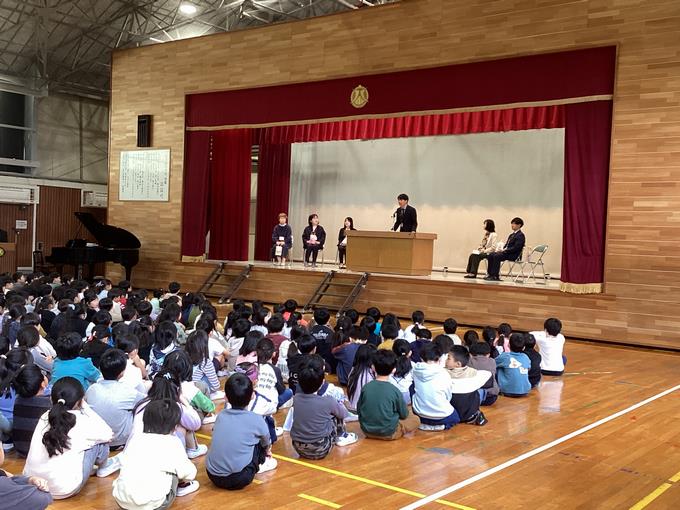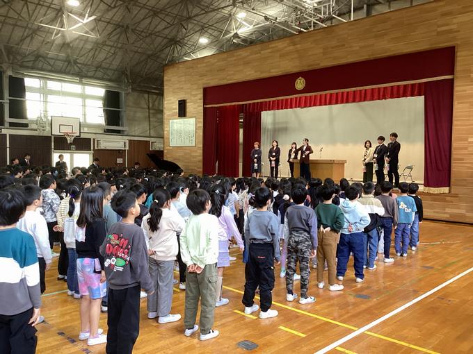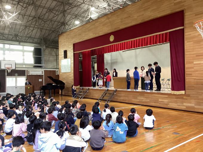 式では、先生方から子どもたちへ向けて温かいメッセージが送られました。一人ひとりの心に深く届く言葉に、これまでの温かな関わりを改めて感じる時間となりました。代表児童が感謝の気持ちを込めて花束やメッセージを渡す場面では、会場全体が優しい雰囲気に包まれ、大変感動的なひとときとなりました。最後には、去りゆく先生方へ精いっぱいの校歌を送りました。子どもたちの歌声が響き渡り、心温まる締めくくりとなりました。