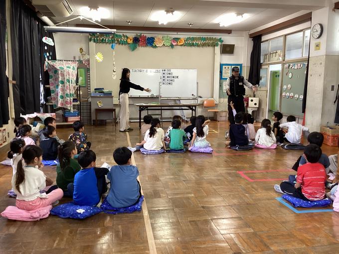 最後に、子供たちは体育館に集まり、不審者に遭遇した時の「いかのおすし」や、自転車の安全な乗り方について、警察署の方からお話をいただきました。自分の身を自分で守るために何をすればよいか、子供たち一人一人が真剣に考えることができました。
