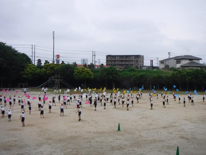 雨天の合間を縫って、高学年も校庭で運動会練習を