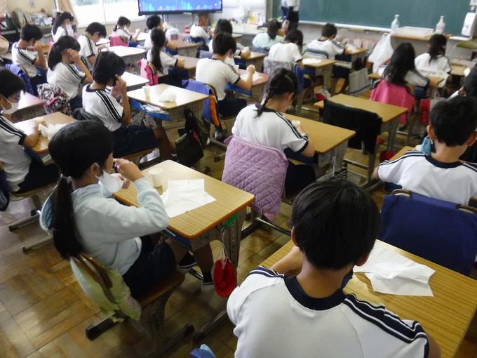 先週から、歯の健康を守るためにフッ化物洗口に取り組んでいます。フッ素が配合された洗口液を口に含み、隅々まで行きわたらせます。このフッ素がコーティングされることで、虫歯菌などから歯を守ります。