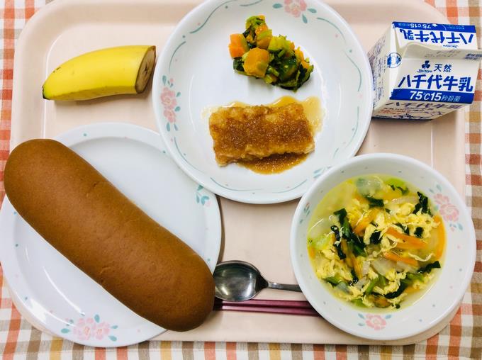 黒コッペパン、いかのアップルマリネ、かぼちゃサラダ、洋風卵スープ、バナナ