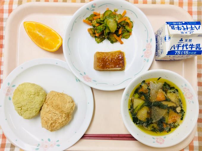 おはぎ(きなこ・うぐいすきなこ)、生揚げの甘辛焼き、きゅうりの土佐和え、けんちん汁、オレンジ