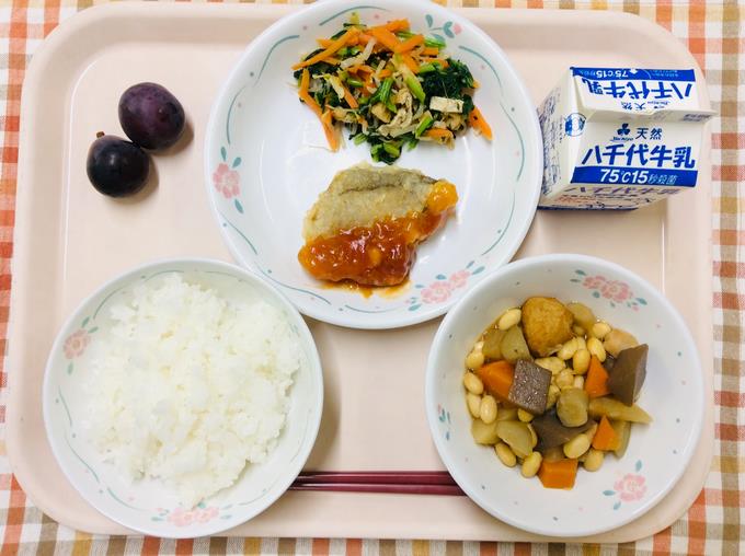 ご飯、白身魚の甘酢あんかけ、おひたし、大豆と揚げボールの煮物、ぶどう