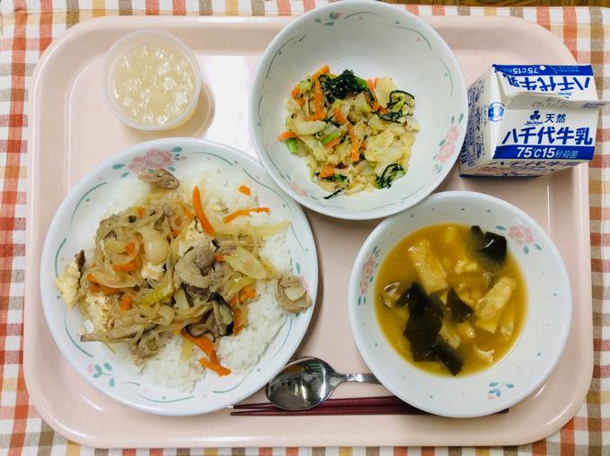 すき焼き風丼、ごま酢和え、じゃが芋のみそ汁、梨ゼリー